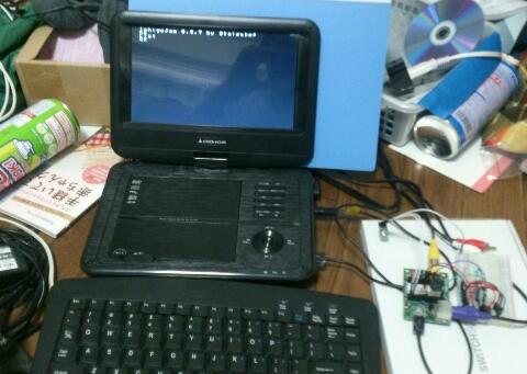 クリスタルはNTSCを安定させるためには必要で、クリスタルをつけるとファームの書き換えが必要で、ファームの書き換えにはシリアルが必要で、ってな感じで、結局ビデオユニット以外全部パーツを買ってきて追加しました。いや、ブレッドボードって始めて使ったんだけど、回路図みながらパッチするだけでできあがるってすごいね。